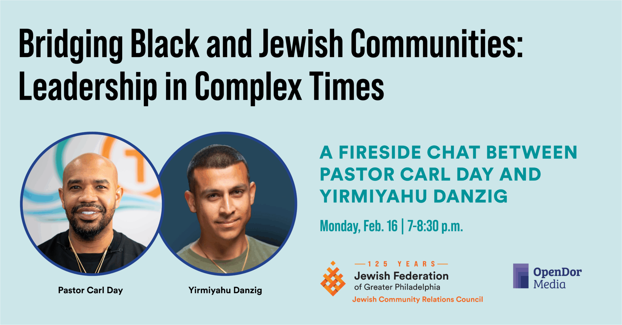 Thank you for your interest in joining us for Bridging Black and Jewish Communities: Leadership in Complex Times – A Fireside Chat Between Pastor Carl Day and Yirmiyahu Danzig on Monday, Feb. 16 from 7-8:30 p.m. at the Weitzman National Museum of American Jewish History.